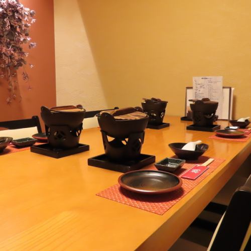 完全個室多数完備。全8室掘りごたつ3部屋お座敷5部屋10名、15名様用の個室にも対応。他半個室4名様用テーブル席もございますので、御座敷に座れない方や車椅子の方にもご利用いただけます。カウンター席は全8席。お一人様でも気軽にお楽しみ頂けます。